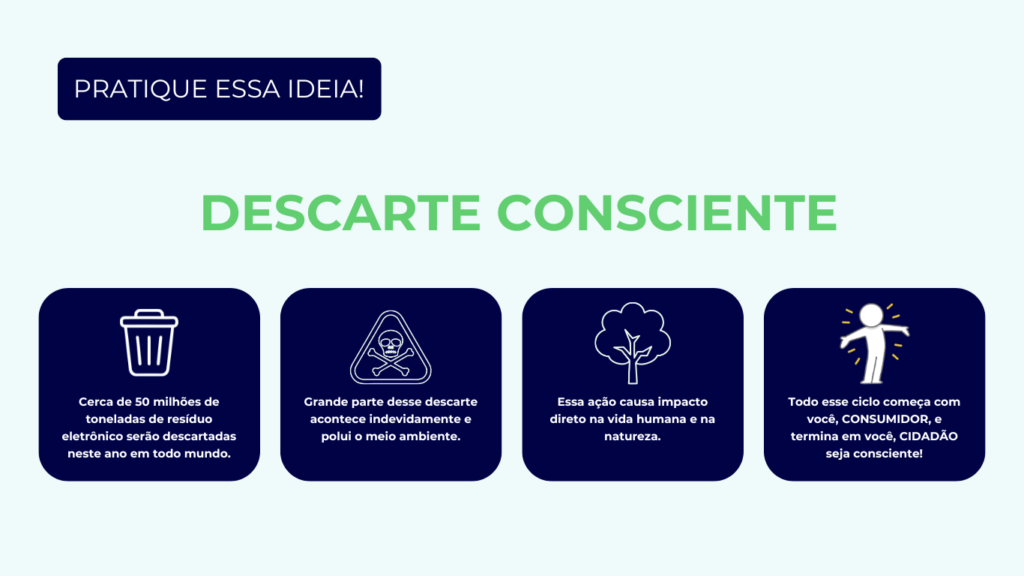 O descarte correto efetuado pela Cooperativa InfinityTech, tem um enorme impacto Sócio-Ambiental a começar pela a proteção do meio ambiente o descarte inadequado de resíduos pode contaminar o solo, a água e o ar, causando danos à saúde e ao ecossistema. Ao descartar coma a InfinityTech esses resíduos são avaliados e levemente garimpados e direcionado as industrias parceiras para se tornar matéria-prima novamente e o que não pode ser reciclado, este tem seu descarte ambientalmente correto sem causar danos a natureza.
